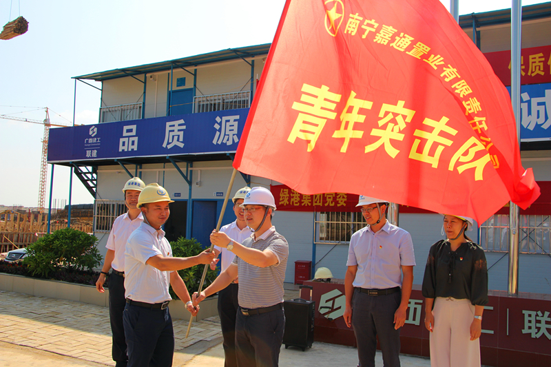 在授旗儀式中,集團黨委書記、董事長、總經(jīng)理龔國強對南寧科技產(chǎn)業(yè)園項目人員前期所做出的工作給予了充分肯定,贊揚了黨員先鋒隊員、青年突擊隊員和工人朋友們?yōu)轫椖拷ㄔO(shè)所付出的艱苦和努力,當前項目進展取得了較好的成績。自8月12日南寧科技產(chǎn)業(yè)園項目正式開工以來,嘉通公司黨支部帶領(lǐng)工人們?nèi)找箍喔桑Х桨儆嬁朔毫拥呐_風(fēng)天氣等不利因素,在短短的2個月時間便完成1#樓廠房一層的搭設(shè)模板,2#、3#樓回填基礎(chǔ)土方,4#樓防水保護層澆筑以及9#宿舍樓基礎(chǔ)承臺澆筑等工作,充分展現(xiàn)了綠港鐵軍風(fēng)采。下一步,希望全體黨員先鋒隊、青年突擊隊隊員們以此次授旗為契機,繼續(xù)發(fā)揚綠港鐵軍精神,創(chuàng)先爭優(yōu),攻堅克難,加快推進項目建設(shè),確保項目如期建成交付。