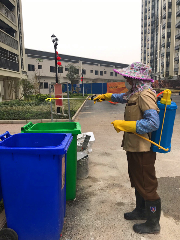 萬方物業(yè)公司正在對園區(qū)進(jìn)行消毒消殺