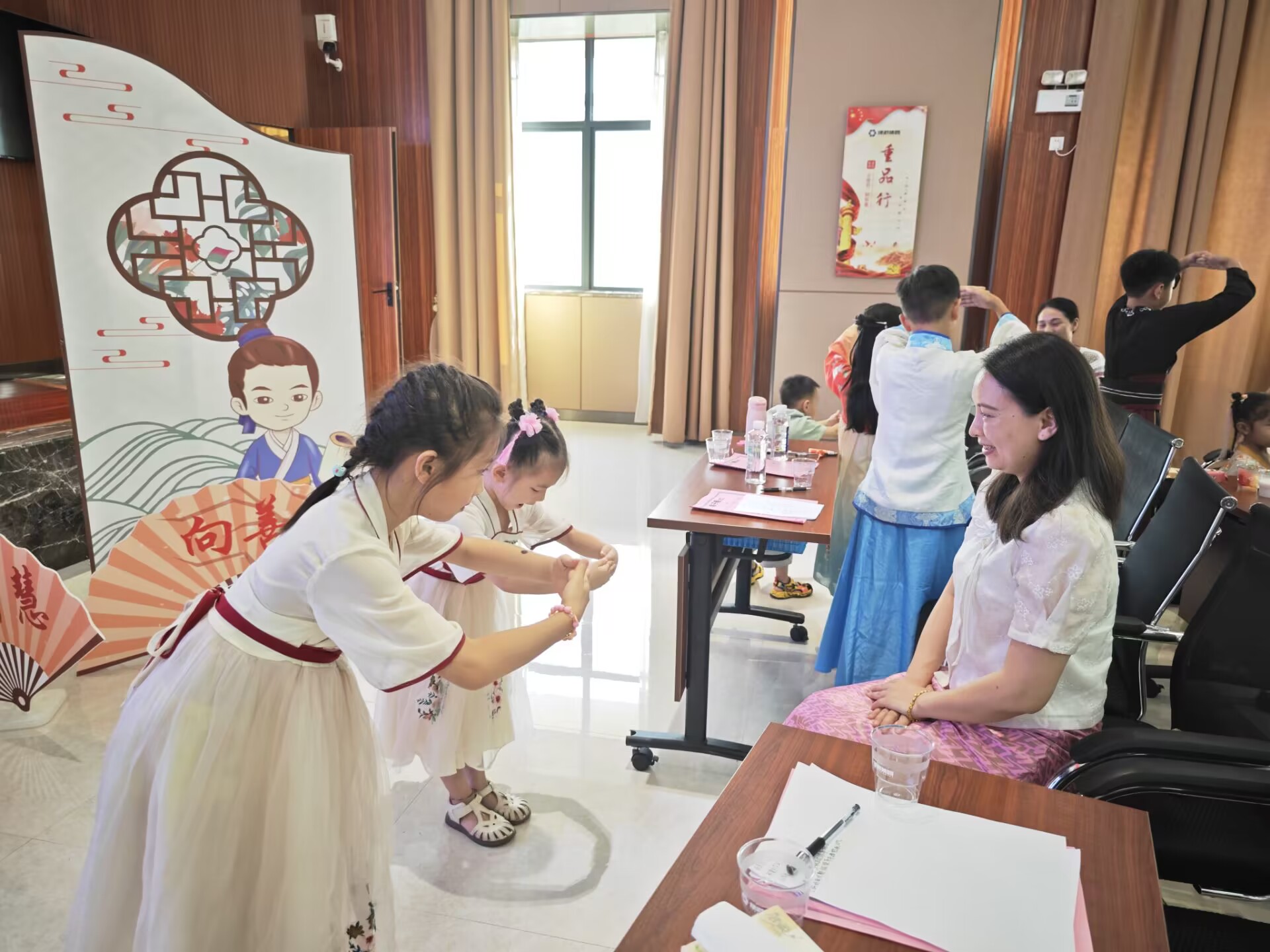 活動(dòng)以傳統(tǒng)禮儀的學(xué)習(xí)和體驗(yàn)為主題,此次培訓(xùn)邀請(qǐng)了廣西經(jīng)貿(mào)職業(yè)技術(shù)學(xué)院智慧商務(wù)產(chǎn)業(yè)學(xué)院的老師韋斯斯講授少兒禮儀知識(shí)。活動(dòng)中,韋老師向孩子們講解了《弟子規(guī)》中學(xué)習(xí)的重要、做人的道理以及待人接物的禮貌常識(shí),讓大家更好地理解傳統(tǒng)的禮儀。韋老師親身示范,教授大家如何正確行認(rèn)知禮儀、家庭禮儀、餐桌禮儀、待客禮儀、交往禮儀、入泮禮、作揖禮、孝道禮儀等,在抬手躬身中感受禮儀之邦的古韻,學(xué)習(xí)尊師重教的品德。韋老師結(jié)合理論知識(shí)學(xué)習(xí),邀請(qǐng)孩子們上臺(tái)實(shí)操演練,模擬情景表演、開展親子互動(dòng)小游戲等,孩子們紛紛上臺(tái),為大家展示,將學(xué)到的文明禮儀知識(shí)落實(shí)到行動(dòng)中,培訓(xùn)現(xiàn)場(chǎng)生動(dòng)形象、氣氛熱烈,孩子們?nèi)褙炞⒙?tīng)取老師的講解,依照老師的示范,認(rèn)真的學(xué)習(xí)禮儀,體驗(yàn)傳統(tǒng)禮儀。