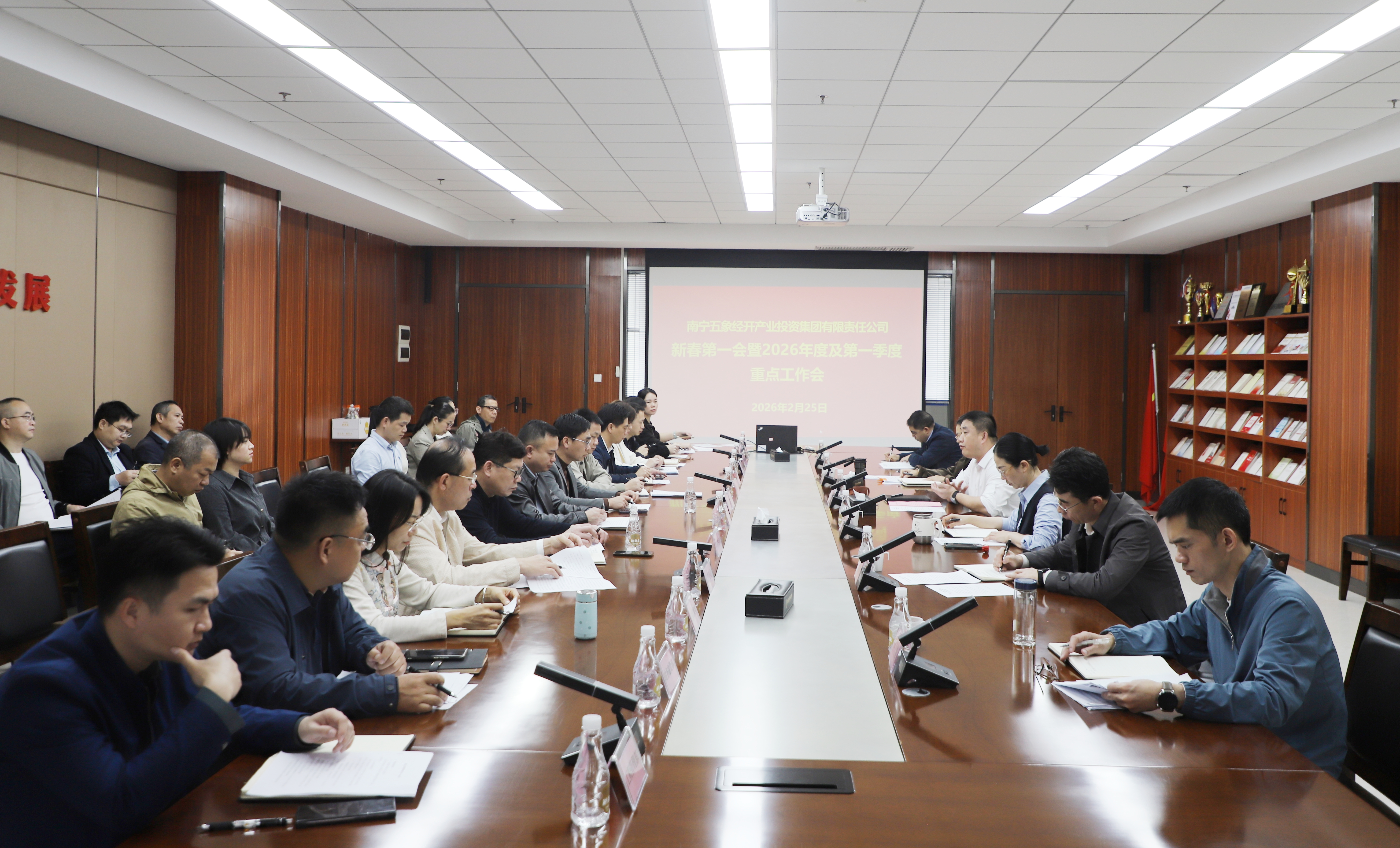 一年春作首,萬事干為先。2月26日上午,五象經(jīng)開產(chǎn)投集團(tuán)組織召開2026年新春第一會(huì),深入貫徹落實(shí)自治區(qū)、南寧市、五象新區(qū)2026年“新春第一會(huì)”會(huì)議精神,系統(tǒng)分析集團(tuán)公司發(fā)展現(xiàn)狀,研究部署2026年及一季度重點(diǎn)工作,動(dòng)員全集團(tuán)上下統(tǒng)一思想,明確工作目標(biāo),全力以赴拼經(jīng)濟(jì)、抓落實(shí)、促發(fā)展,全面化解歷史矛盾,全力促進(jìn)安全穩(wěn)定,奮力爭(zhēng)取一季度開門紅,為全年破局突圍筑牢基礎(chǔ)。集團(tuán)黨委書記、董事長(zhǎng)羅祥濤主持會(huì)議并講話,集團(tuán)領(lǐng)導(dǎo)班子、中層副職以上管理干部及各子公司班子成員參加會(huì)議。